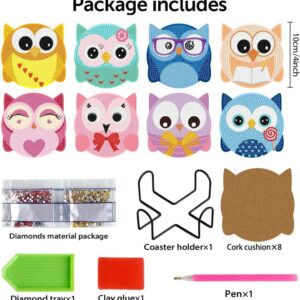 8 PCS Owl Diamond Art Coasters with Holder – DIY Gem Painting Kit for Beginners & Adults