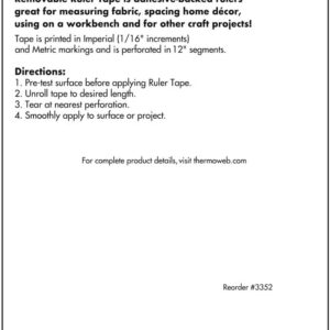 -10%• These removable, adhesive backed rulers are printed in Imperial (inch markings) and Metric markings • They are perforated and repeat in 12 inch segments • Great for marking fabric or work surfaces for quick measurements while cutting or trimming • Printed rulers on the front, low tack adhesive on the back; Imperial and Metric notations • Made in U. S. A.Sku: B-FUSION-239
