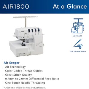 -10%• Air Technology: Thread the AIR1800 with a blast of air. With threading ports that are connected to the end of each looper by tubes, at the press of a button, a gust of air sends the threads through the looper, so, it's a breeze to change thread colors. • Stitch Quality: Achieve outstanding finishing touches with flatlock, overlock, and rolled hem stitches on specialty fabrics and stretchy materials. • Thread Guides: The color-coded thread guides make staying organized and in control a breeze, allowing you to handle two, three, or even four threads simultaneously with one or two needles. • Great for Challenging Materials: Excellent for adding professional finishing touches on fine knits and stretchy materials which can be challenging fabrics on traditional sewing machines. • Brightly Lit Work Area: The AIR1800 has high quality lighting that’s easy on the eyes when sewing on dark fabrics. • This product is intended only in the US at 120 volts, and any other use voids the warranty.in SergersSku: B-FUSION-217