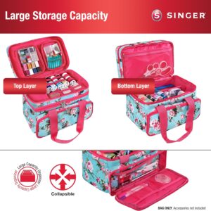 Sewing Accessories Organizer – Double-Layer Bag with 2 Pouches & 18 Compartments, Turquoise Floral