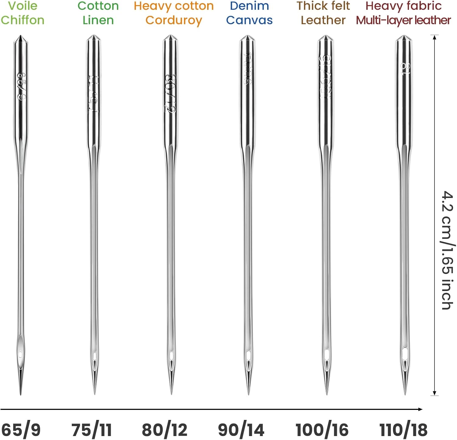 • Ample Quantity: The 60-piece value-pack offers 7 different combinations. There are single-size packs, such as 60 pieces of 65/9, 60 pieces of 75/11, 60 pieces of 80/12, 60 pieces of 90/14, 60 pieces of 100/16, 60 pieces of 110/18 and a 60-piece mixed pack with 10 pieces of each size, meeting diverse sewing needs.