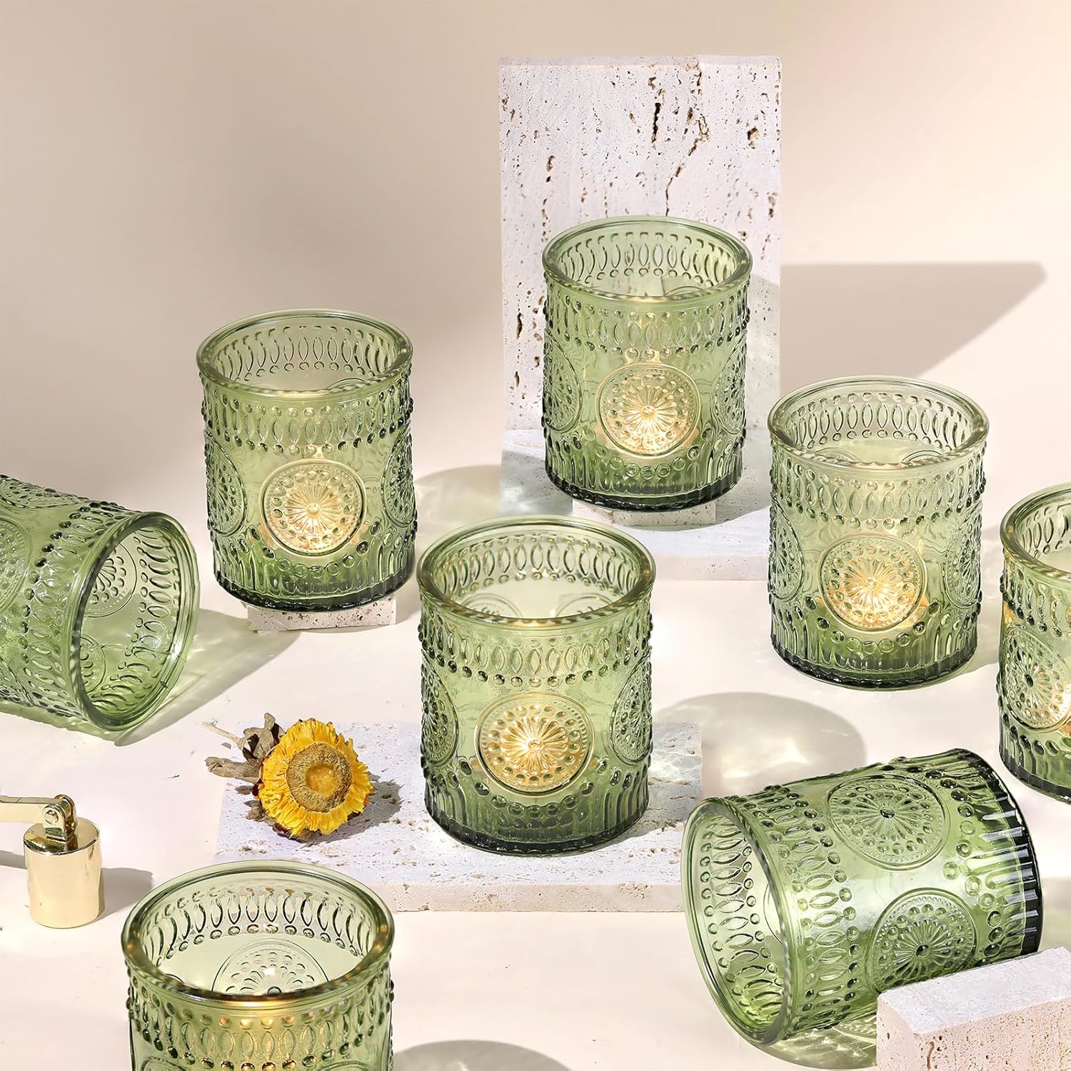 • Retro Sunflower Candle Holders: The retro style embossed sunflower design gives these candle holders a unique and timeless appeal. Reminiscent of a bygone era, they add a touch of nostalgia to your decor. They are sure to be a conversation starter.
