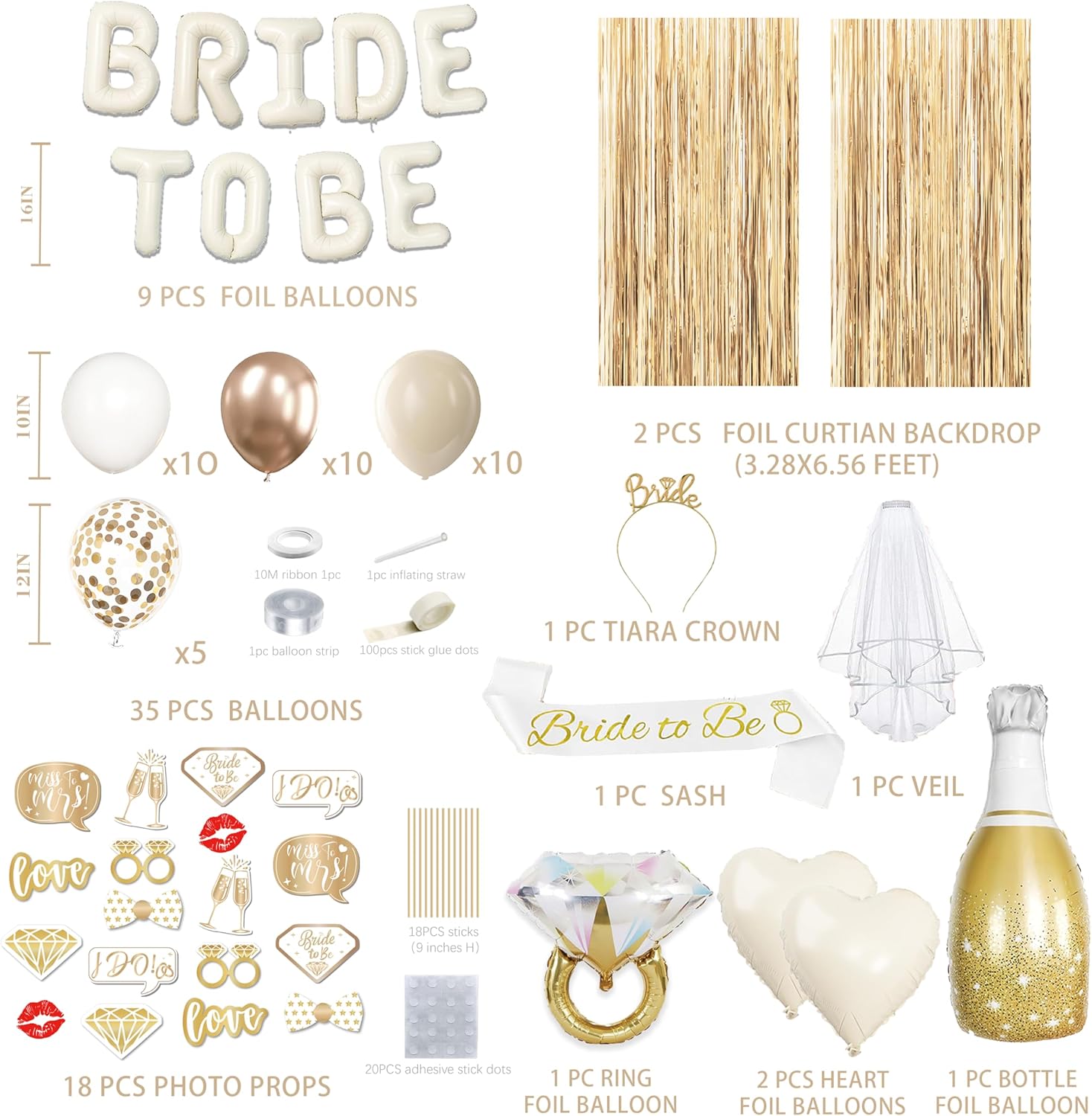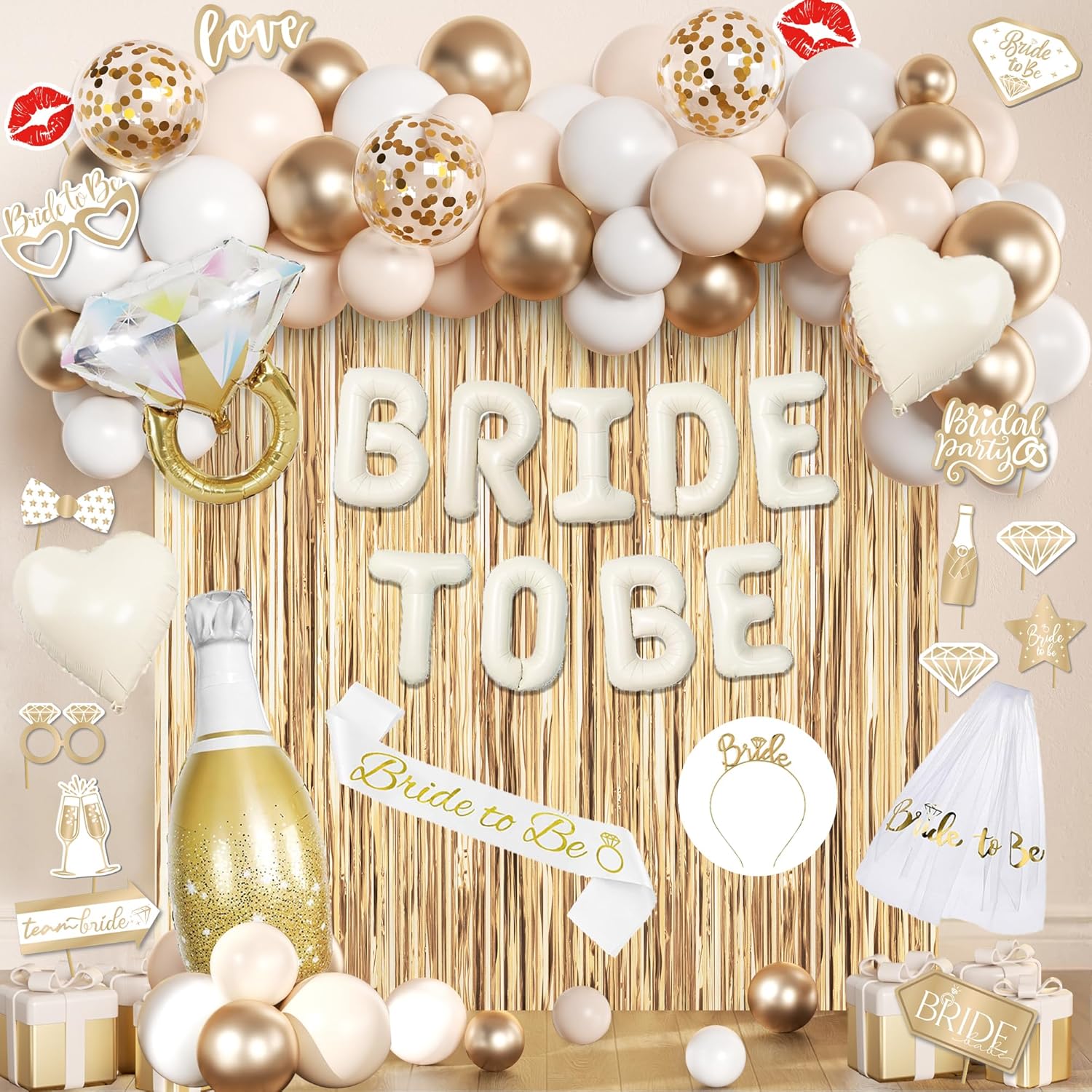 Champagne gold bachelorette set featuring balloons, veil, tiara, sash, and fringe curtains.