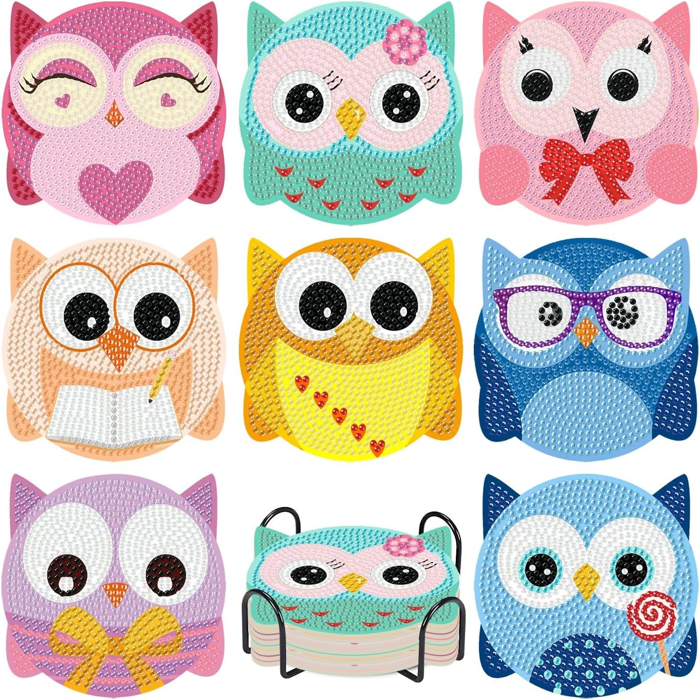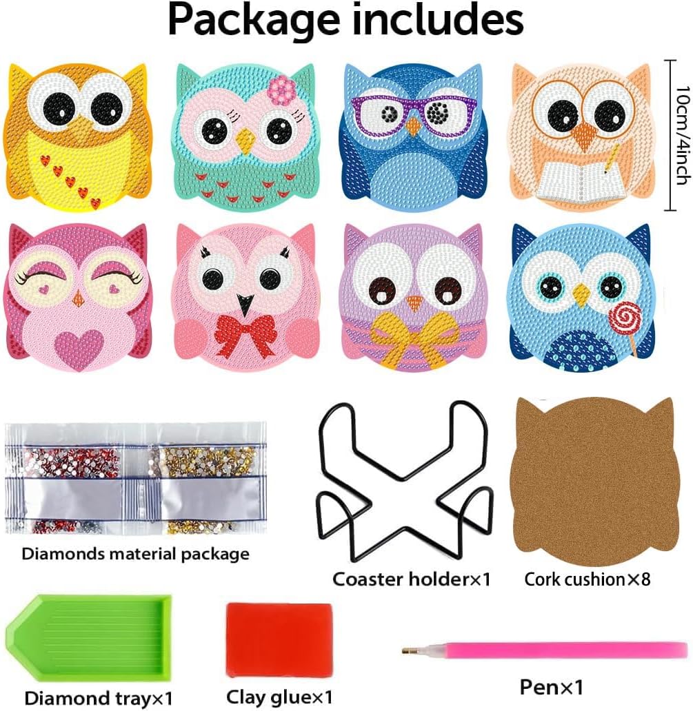 • 【Diamond Art Coasters】: You will get 8 pcs diamond art coasters, including 8 with cork stickers, 1 coaster holder, 1 diamond pen, 1 diamond tray, 1 clay glue and enough number of molded diamonds for a cute and shiny home decor.