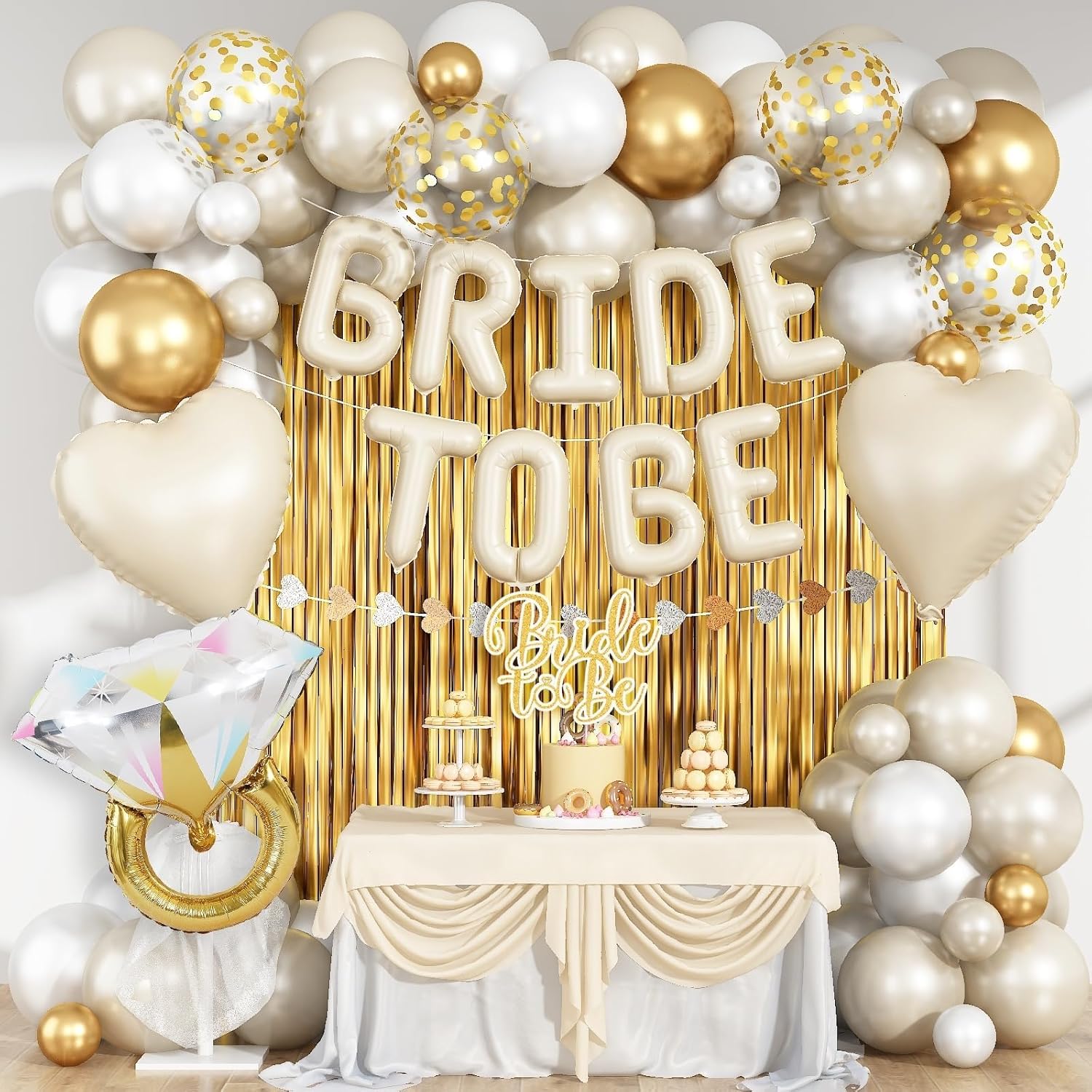 Comprehensive Decor Bundle: Includes “BRIDE TO BE” letters, heart balloons, gold curtains, a cake topper, and a heart banner.