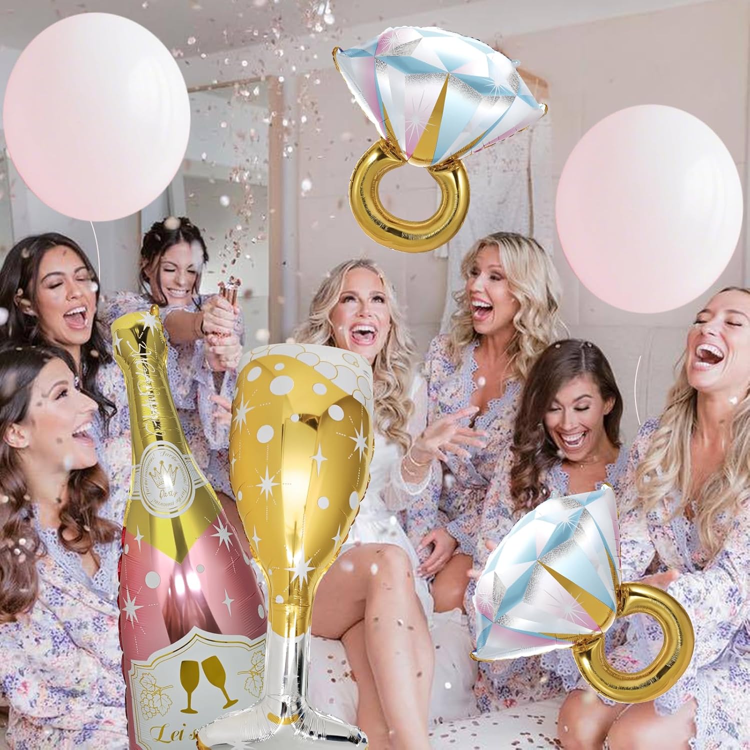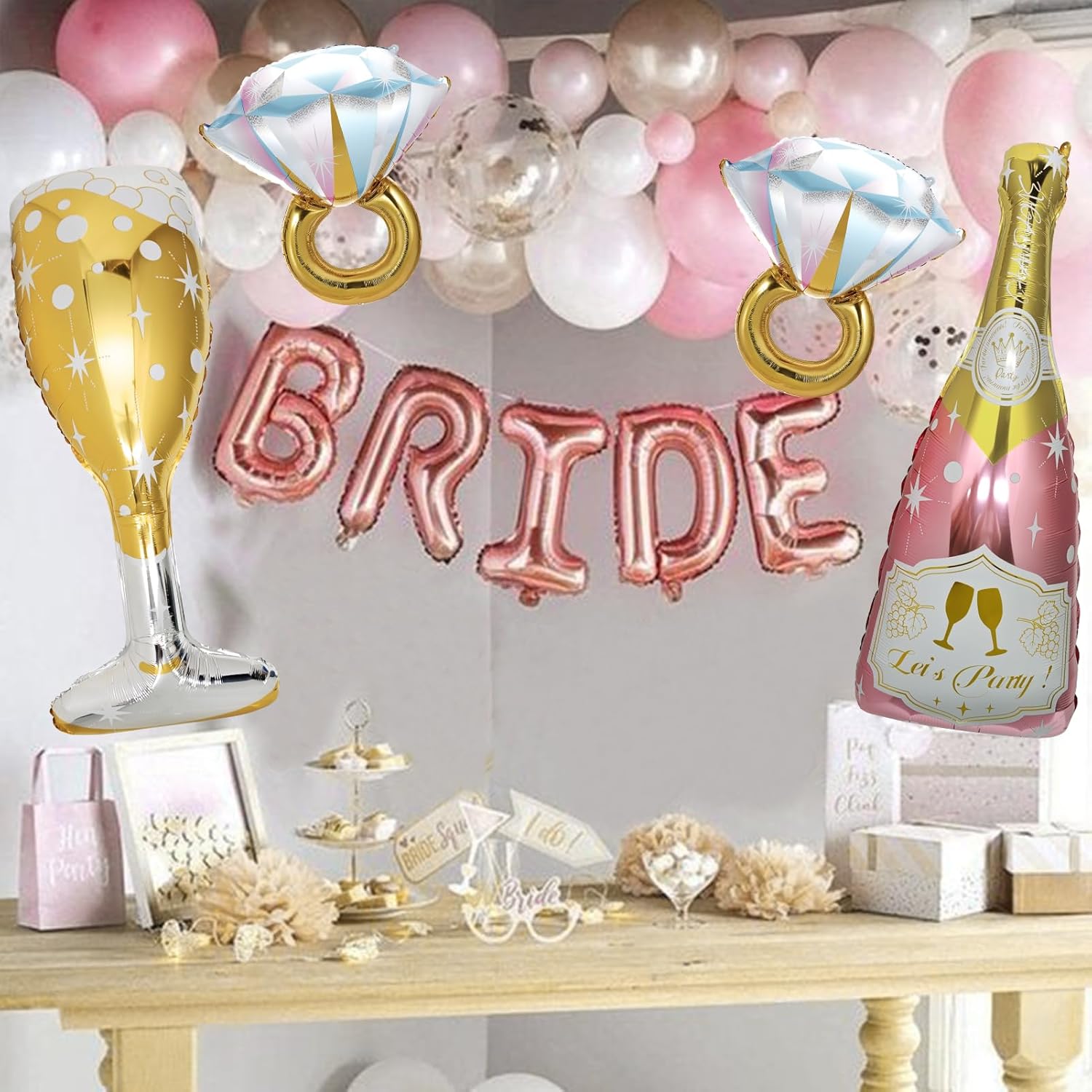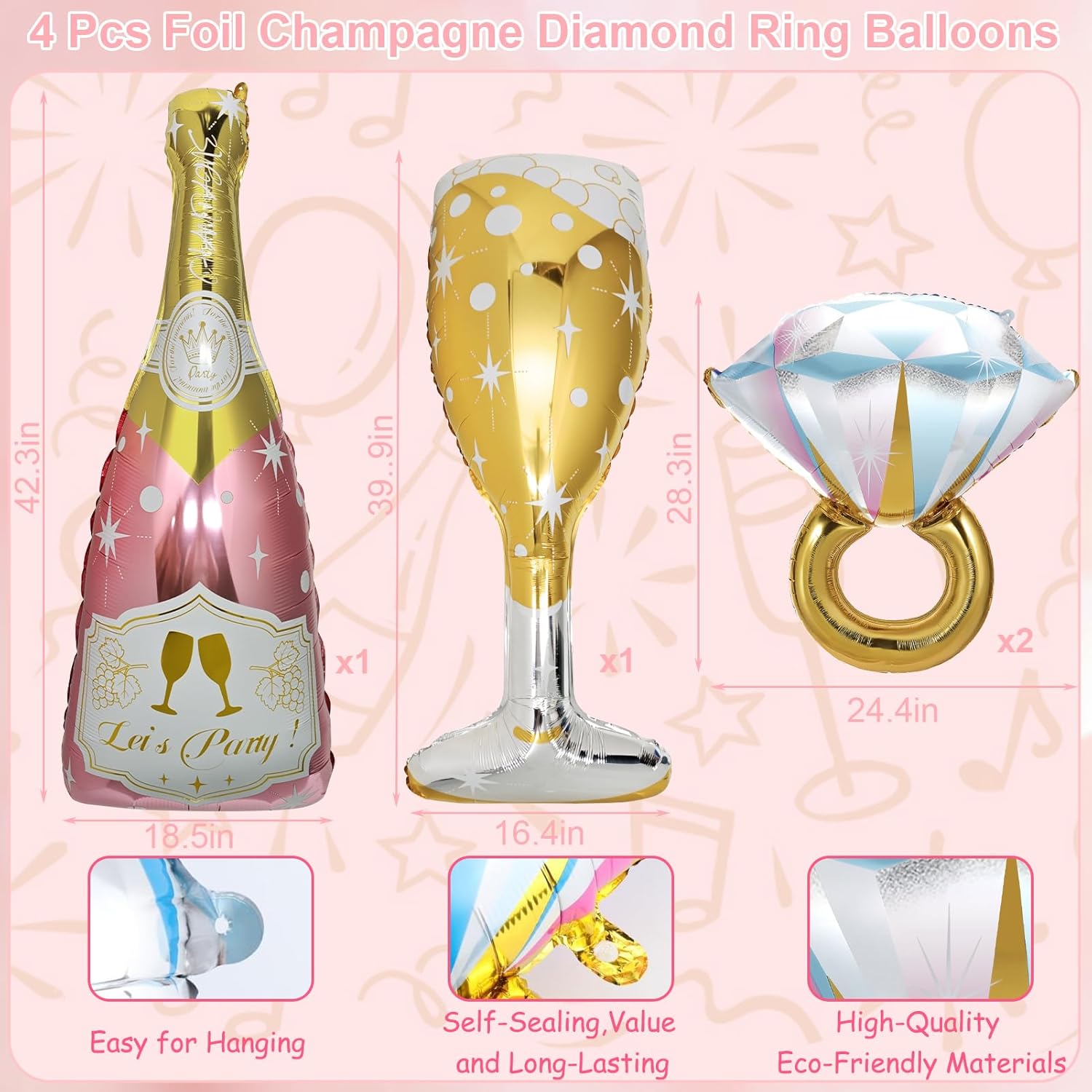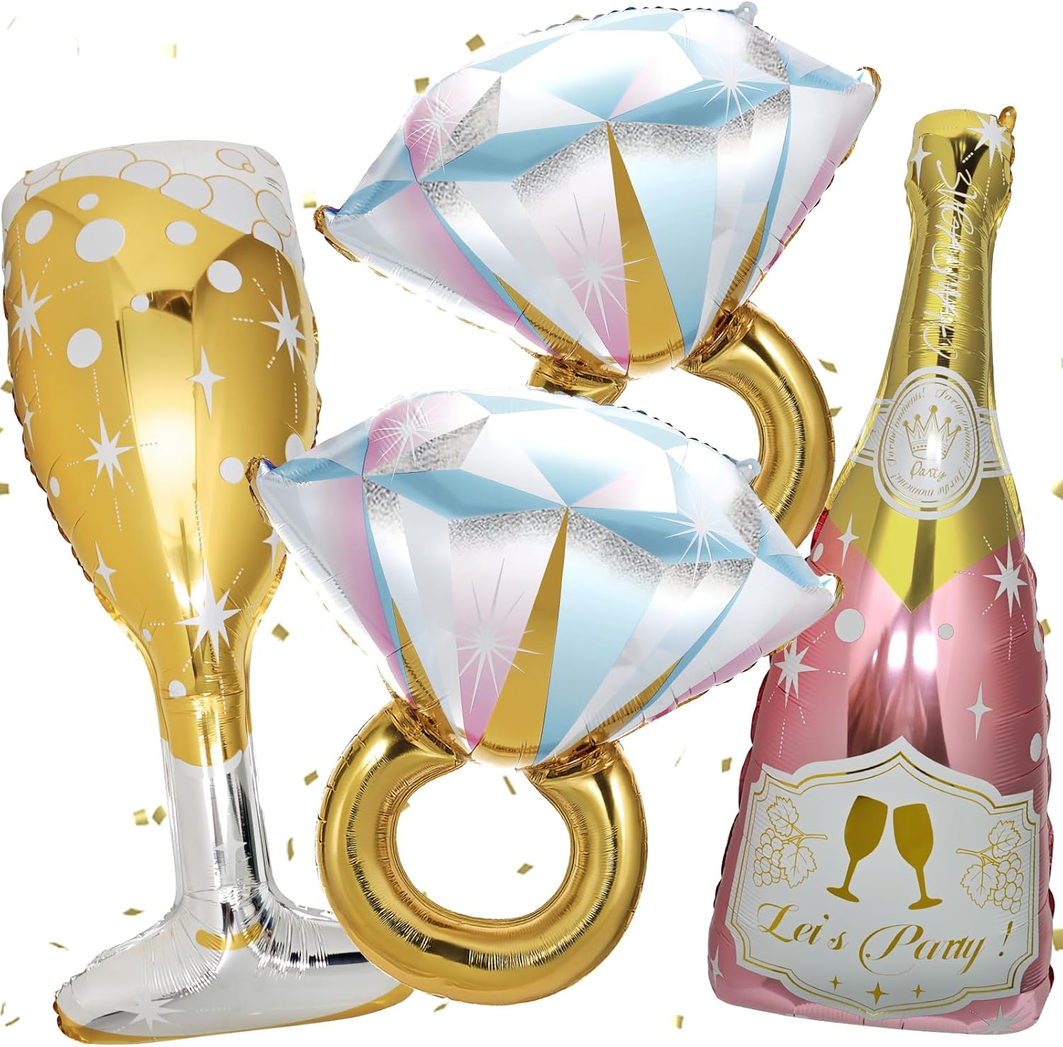 Oversized Foil Set: Includes a 43-inch champagne bottle, a 40-inch goblet, and two 28-inch ring balloons in rose gold.