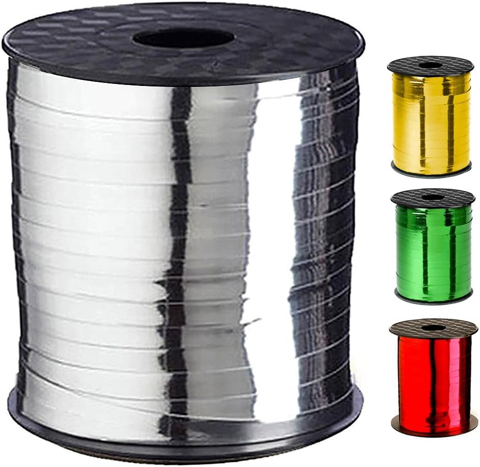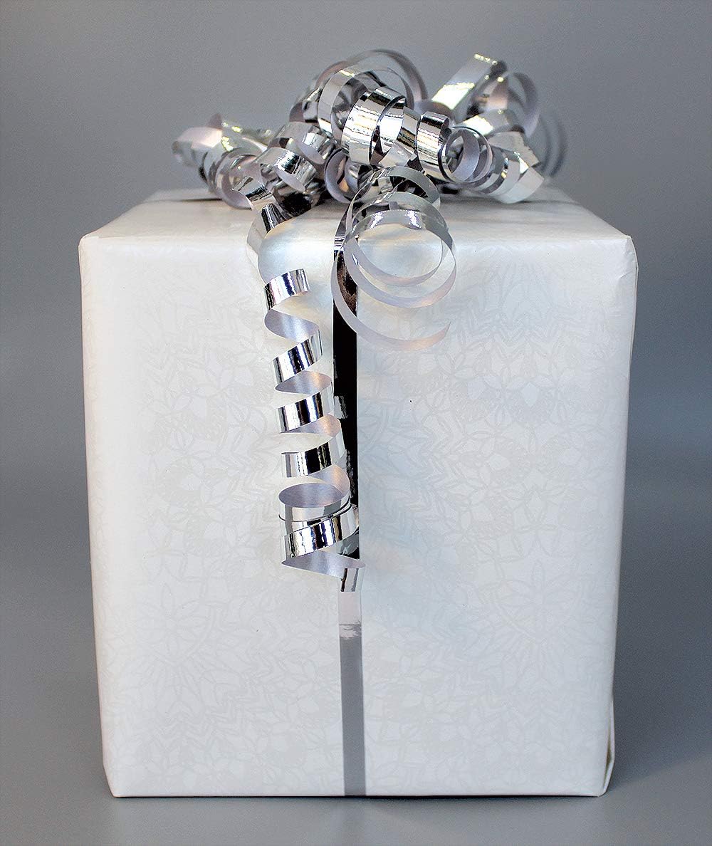 Metallic 500-yard silver curling ribbon for festive holiday crafts and party decorations.