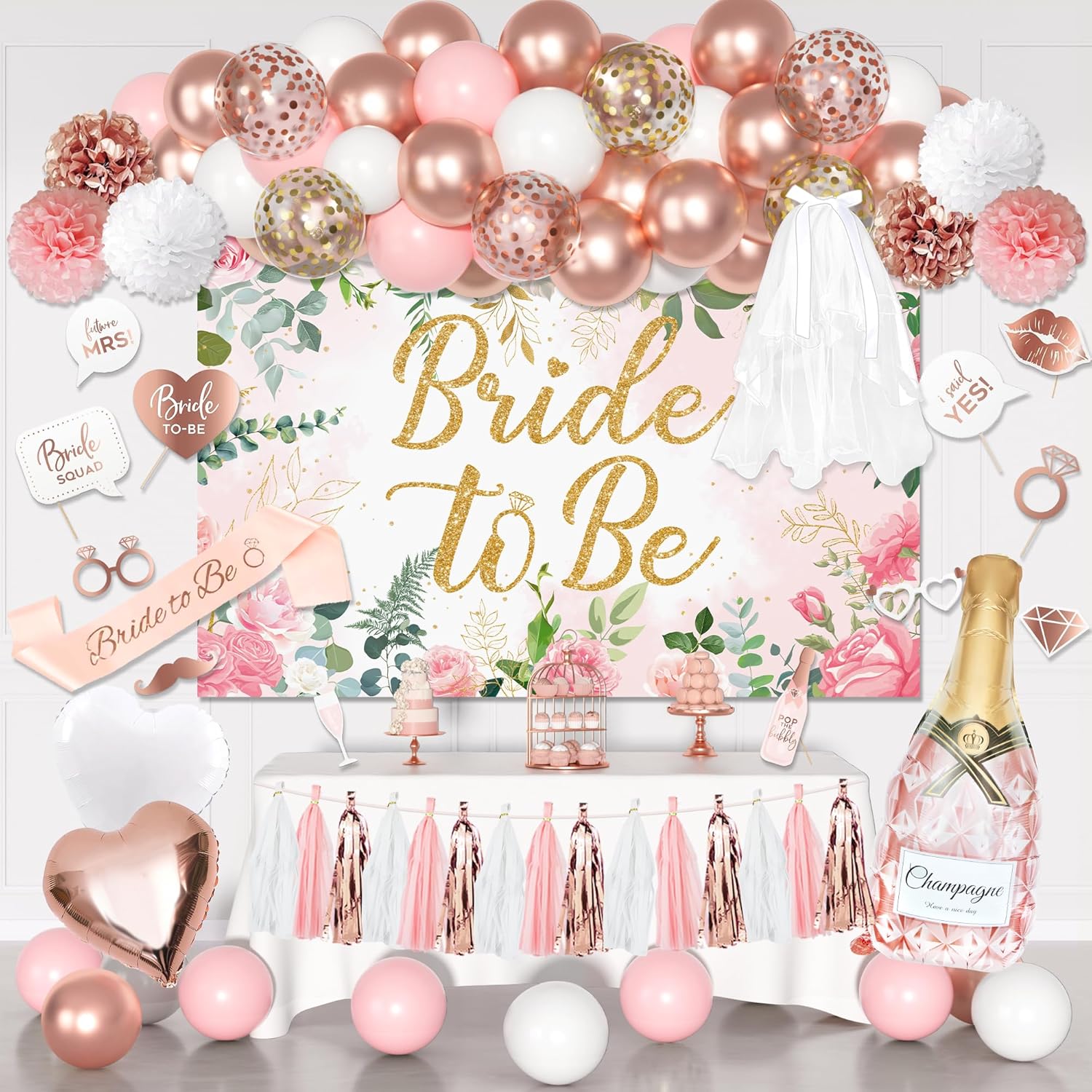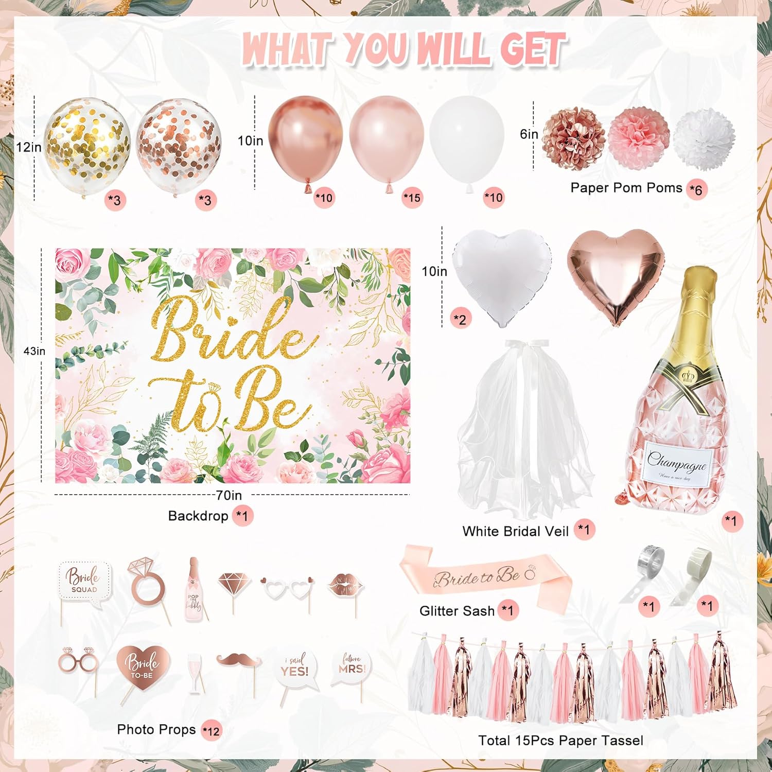 Comprehensive Decor Set: Includes a backdrop, veil, sash, photo props, tassels, paper pom poms, and assorted colorful balloons.