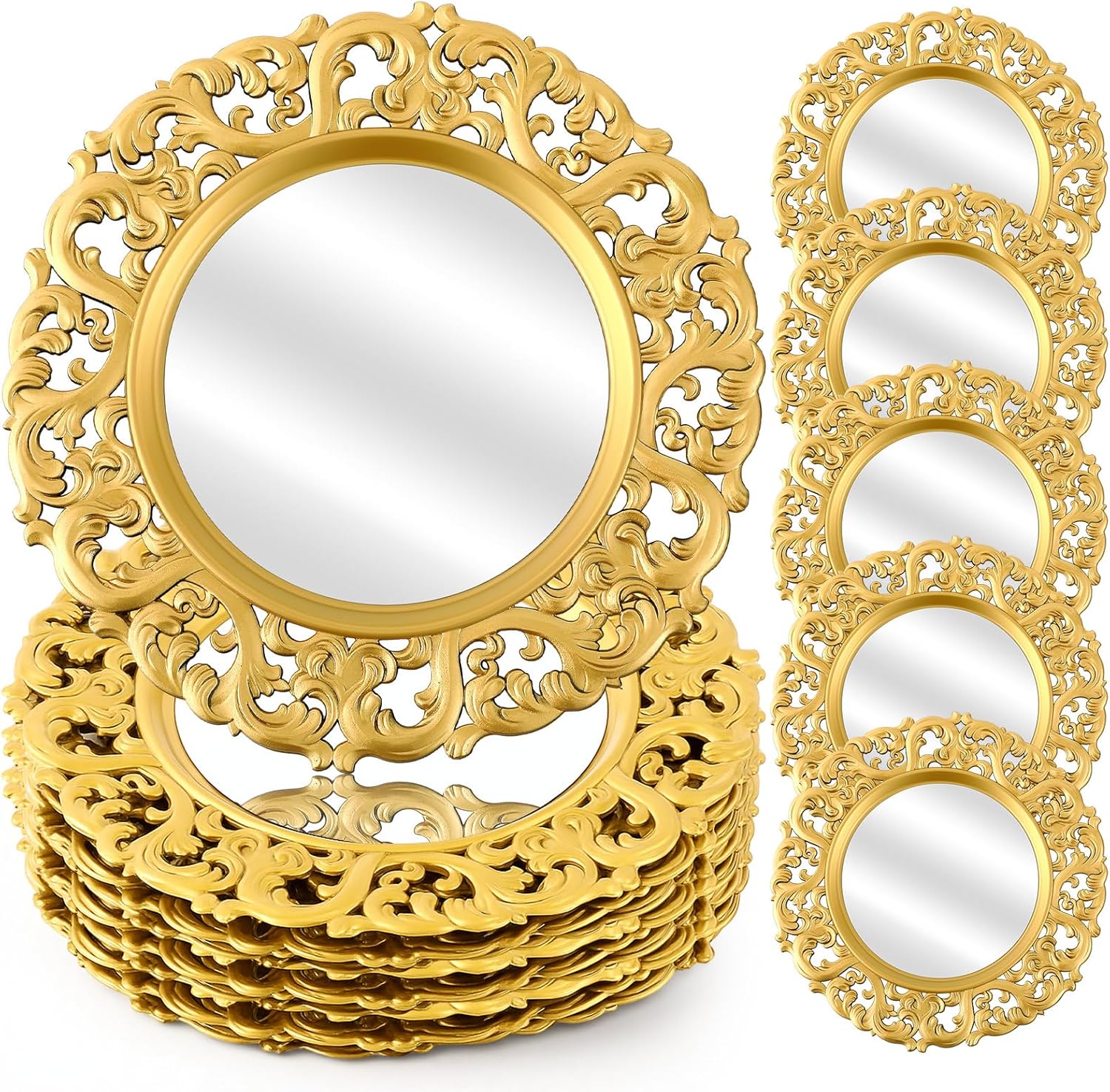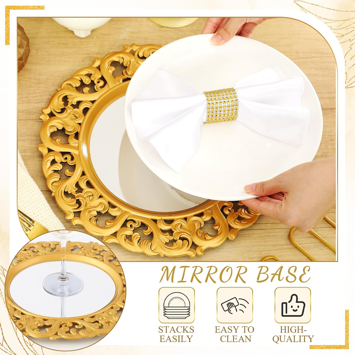 Elevated Table Decoration: Transform weddings and holiday dinners with twelve gold chargers featuring graceful embellishments for a sophisticated tablescape.