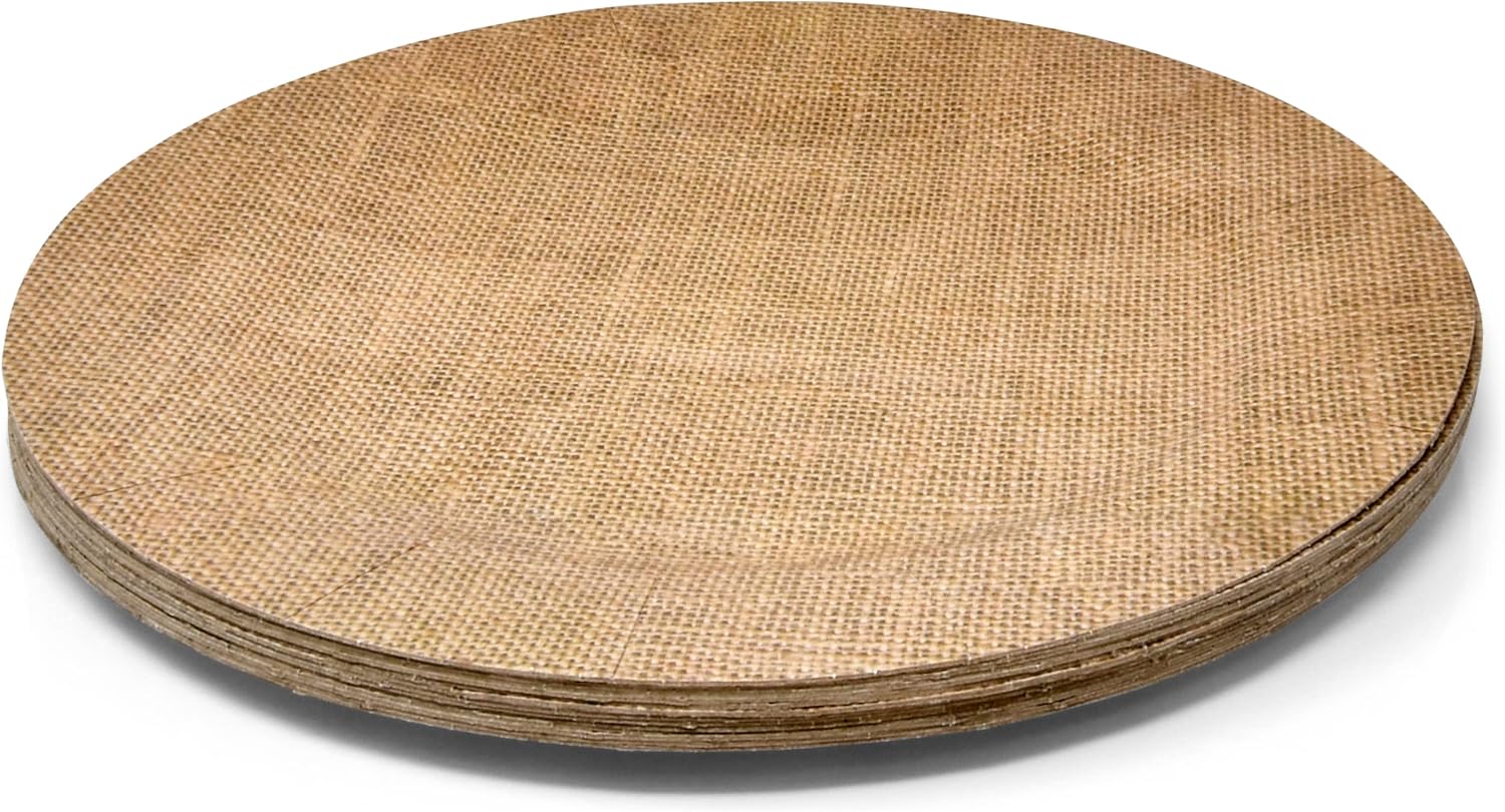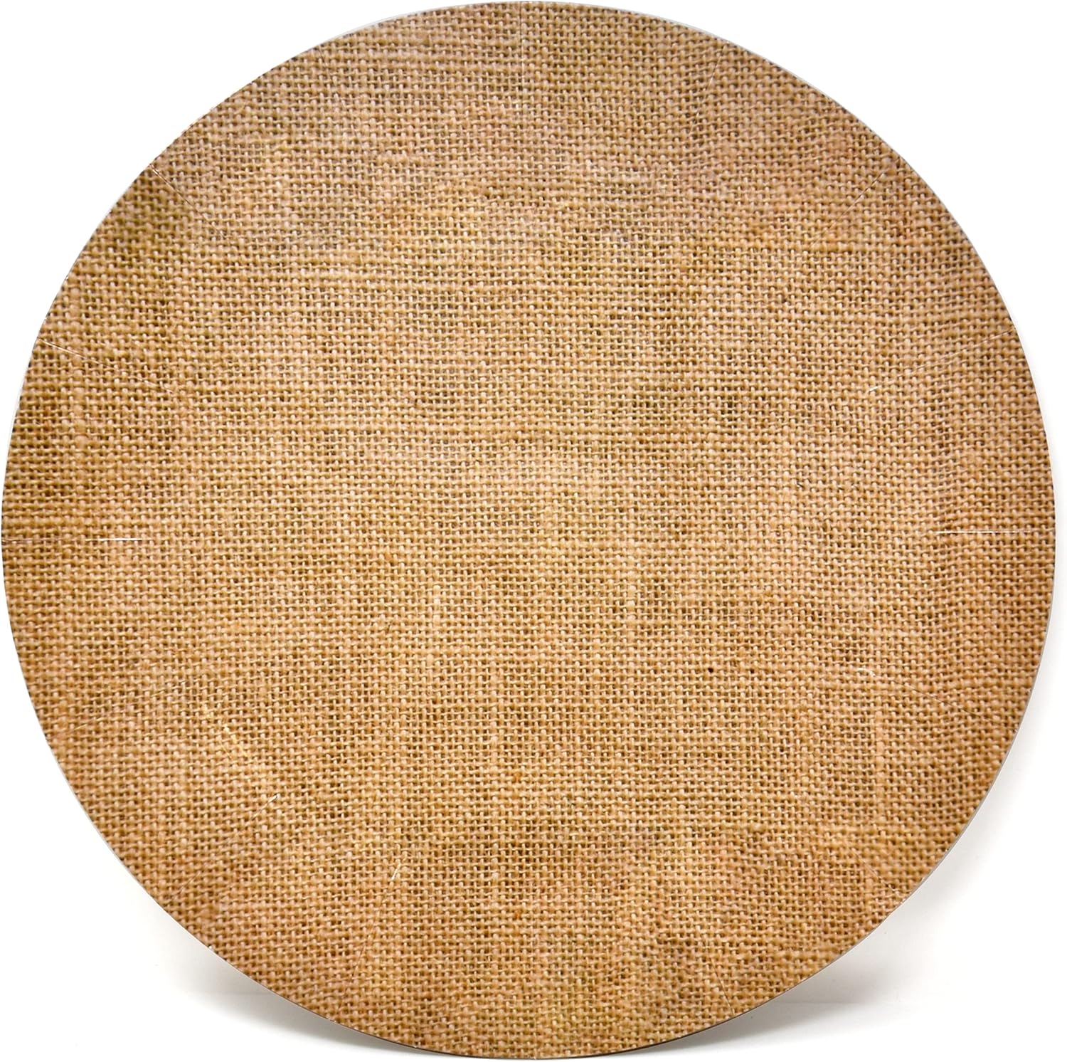 Twenty-four 13-inch disposable cardboard chargers with a rustic burlap print for weddings.