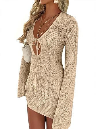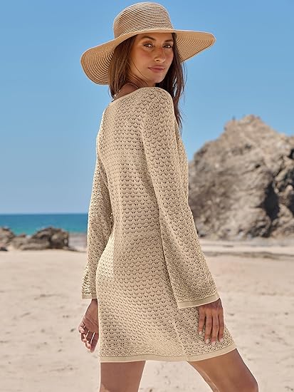 • Features a crochet-style hollow mesh knit with a tie detail at the bust and long sleeves, creating a stylish swim cover up that pairs easily with swimsuits or bikinis. Machine wash with similar colors in a laundry bag and avoid bleach; colors may vary slightly due to lighting or screen display.